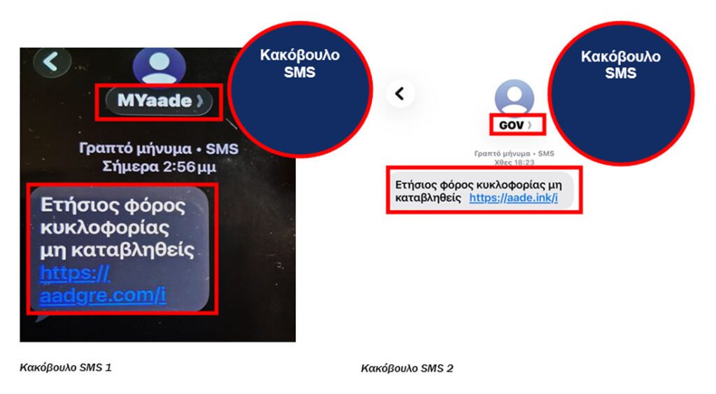 Εμφανίζονται ως "MYaade" ή "GOV" και ζητούν από τους παραλήπτες να πατήσουν σε σύνδεσμο (link) για να πληρώσουν δήθεν τέλη κυκλοφορίας οχημάτων