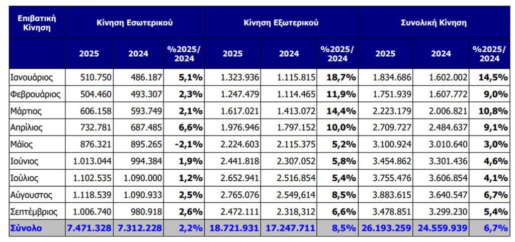 Η επιβατική κίνηση του αεροδρομίου της Αθήνας κατά τη διάρκεια του Σεπτεμβρίου 2025 ανήλθε σε 3,48 εκατ., αυξημένη κατά 5,4% σε σύγκριση με τον Σεπτέμβριο του 2024. Τόσο η εγχώρια, όσο και η διεθνής επιβατική κίνηση παρουσίασαν άνοδο, υπερβαίνοντας τα επίπεδα του 2024 κατά 2,6% και 6,6% αντίστοιχα.