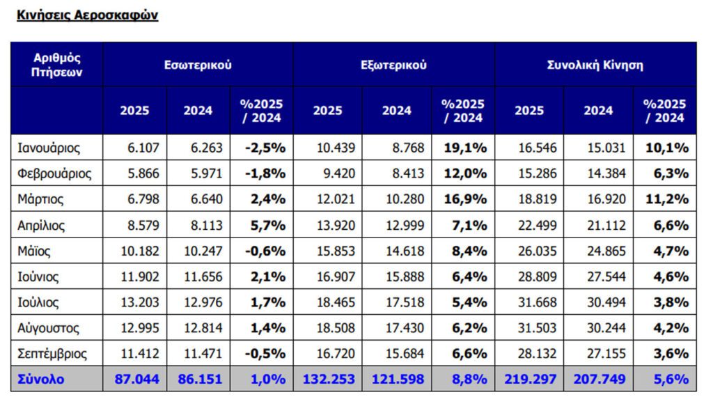 Ο αριθμός των πτήσεων στον Διεθνή Αερολιμένα Αθηνών κατά τη διάρκεια των εννέα πρώτων μηνών του 2025 ανήλθε σε 219.297, καταγράφοντας αύξηση της τάξης του 5,6% σε σχέση με το 2024.