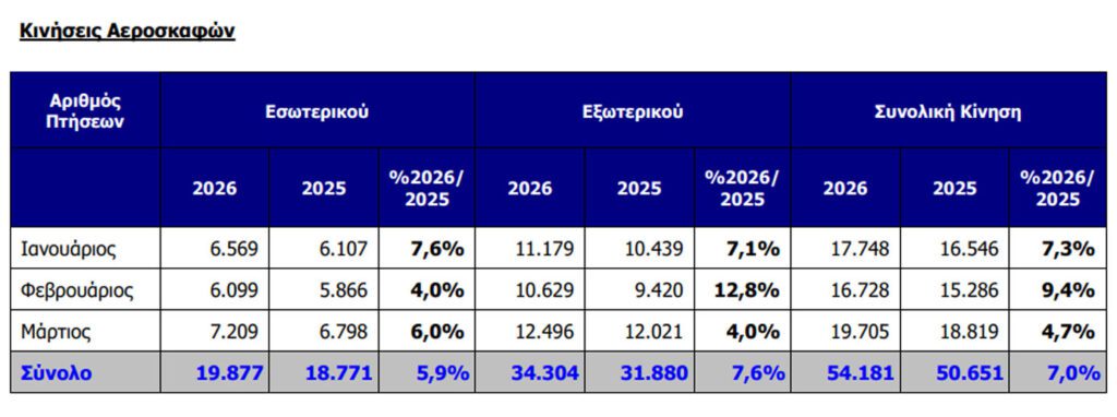 Ο αριθμός των πτήσεων στον Διεθνή Αερολιμένα Αθηνών κατά τη διάρκεια των τριών πρώτων μηνών του 2026 ανήλθε σε 54.181, καταγράφοντας αύξηση της τάξης του 7,0% σε σχέση με το 2025.