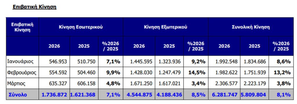 σύγκριση με τους προηγούμενους δύο μήνες, παραμένοντας ωστόσο πάνω από τα επίπεδα του 2025 κατά 4,8% στην εγχώρια επιβατική κίνηση και κατά 3,4% στην κίνηση προς/από το εξωτερικό.