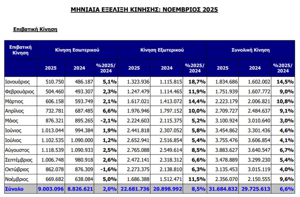 Η επιβατική κίνηση του αεροδρομίου της Αθήνας κατά τη διάρκεια του Νοεμβρίου 2025 ανήλθε σε 2,36 εκατ., αυξημένη κατά 9,6% σε σύγκριση με τον Νοέμβριο του 2024. Τόσο η εγχώρια, όσο και η διεθνής επιβατική κίνηση παρουσίασαν άνοδο, υπερβαίνοντας τα επίπεδα του 2024 κατά 5,0% και 11,5% αντίστοιχα.