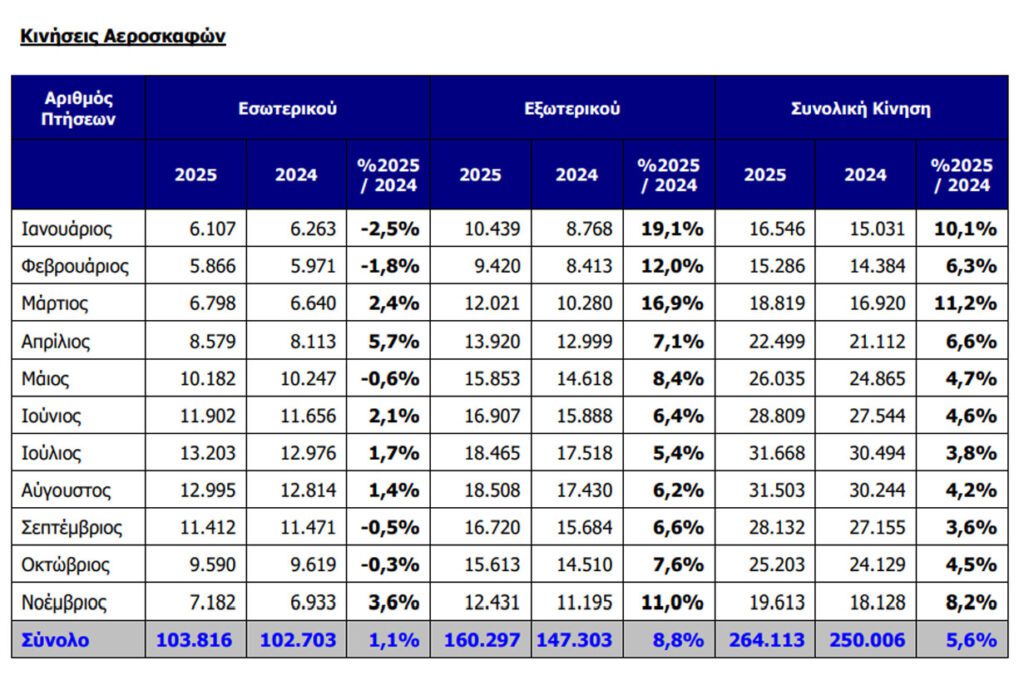 Ο αριθμός των πτήσεων στον Διεθνή Αερολιμένα Αθηνών κατά τη διάρκεια των έντεκα πρώτων μηνών του 2025 ανήλθε σε 264.113, καταγράφοντας αύξηση της τάξης του 5,6% σε σχέση με το 2024.