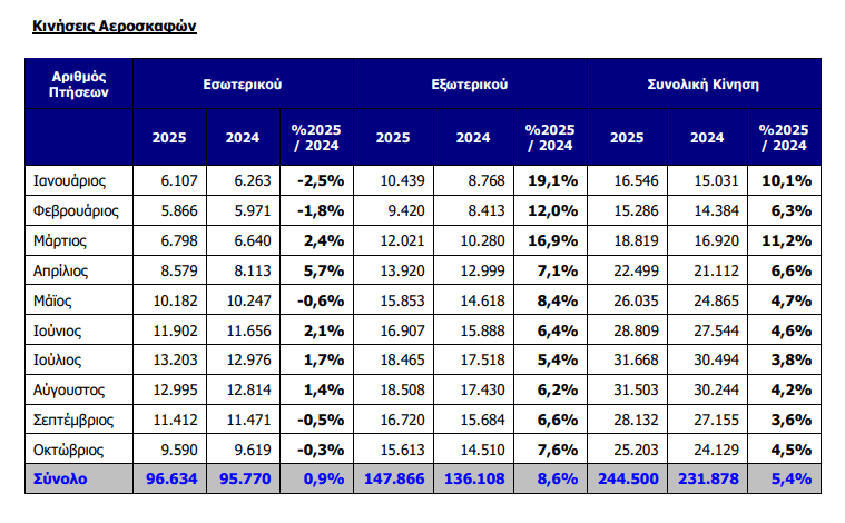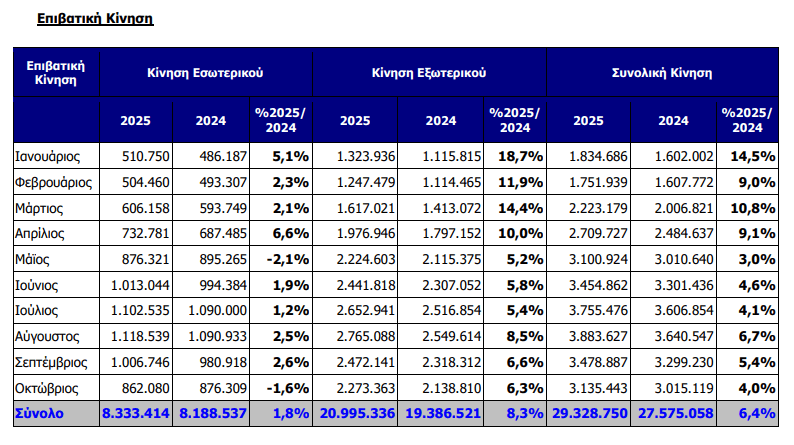 Με βάση τα παραπάνω μεγέθη, ο Οκτώβριος επιβεβαιώνει τη δυναμική της διεθνούς ζήτησης προς την Αθήνα, διατηρώντας υψηλά φορτία και μετά την αιχμή του καλοκαιριού, ενώ το εσωτερικό παραμένει σε ήπια τροχιά, χωρίς να ανατρέπει τη γενική ανοδική τάση του έτους.