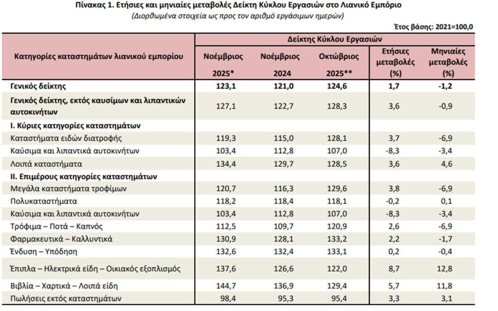 Η Ελληνική Στατιστική Αρχή (ΕΛΣΤΑΤ) ανακοίνωσε τους Δείκτες Κύκλου Εργασιών και Όγκου στο Λιανικό Εμπόριο, με μήνα αναφοράς τον Νοέμβριο 2025, η εξέλιξη των οποίων, σύμφωνα με στοιχεία προσωρινά και διορθωμένα ως προς τον αριθμό εργάσιμων ημερών τυπικού μήνα ίσης χρονικής διάρκειας, έχει ως εξής: