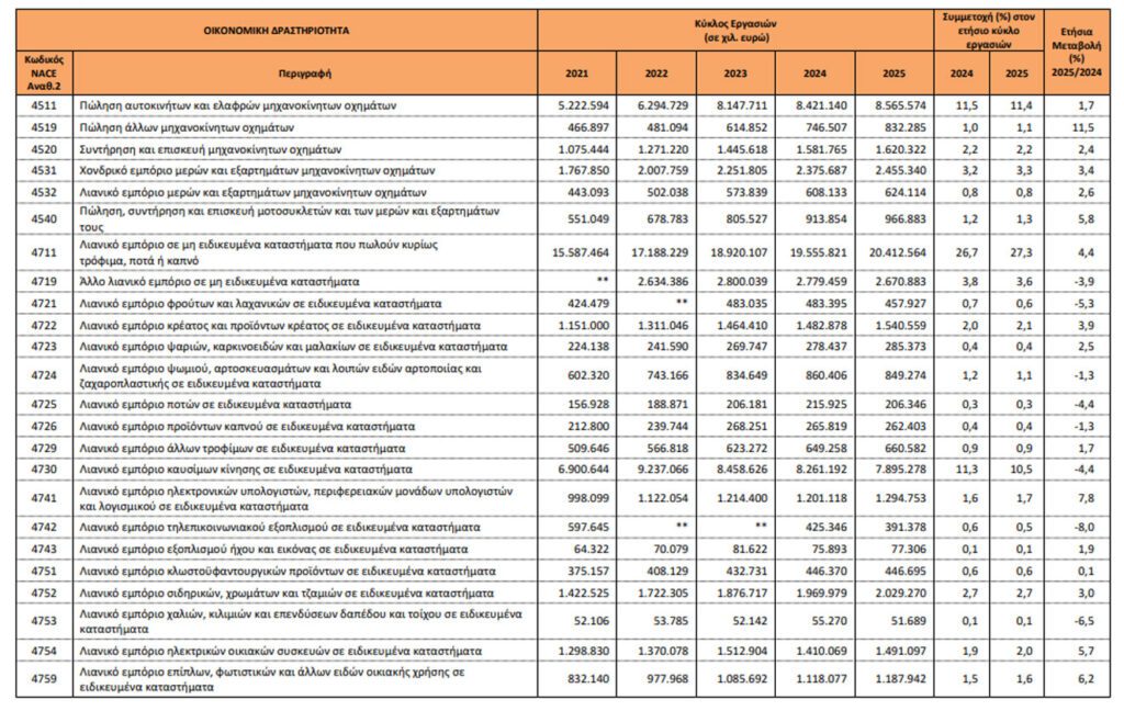 Για τις επιχειρήσεις του τομέα λιανικού εμπορίου, χωρίς τους κλάδους οχημάτων τροφίμων και καυσίμων, ο κύκλος εργασιών το έτος 2025 ανήλθε σε 27.333.669 χιλιάδες ευρώ, σημειώνοντας αύξηση 2,0% σε σχέση με το έτος 2024, όπου είχε διαμορφωθεί σε 26.788.433 χιλιάδες ευρώ.
