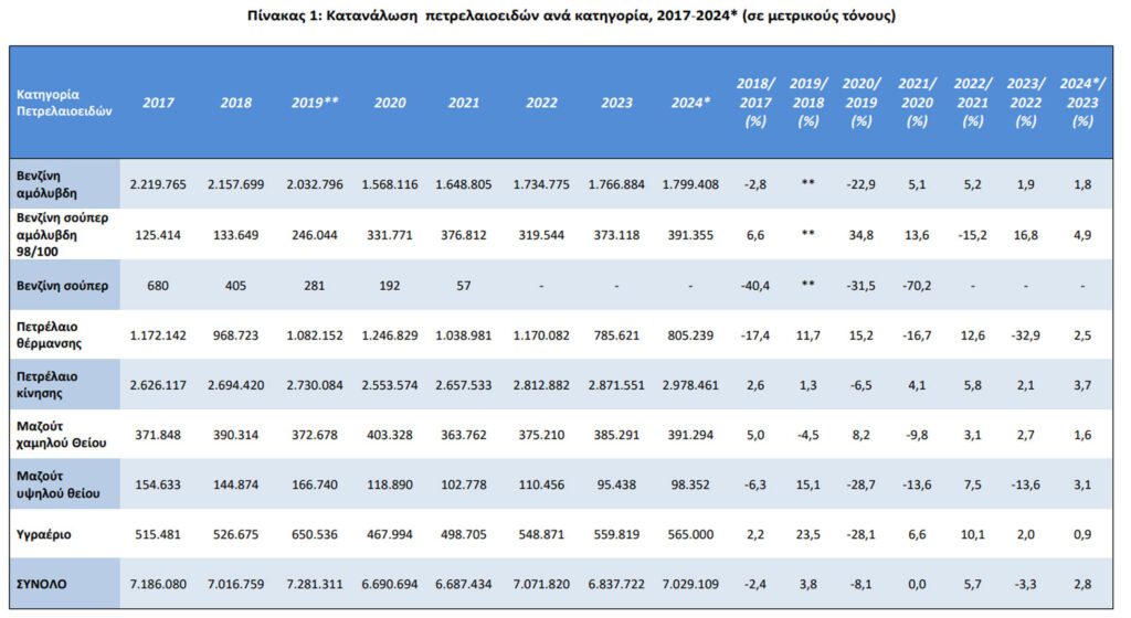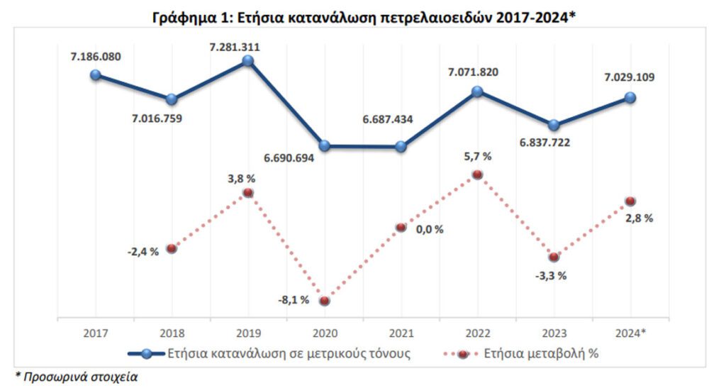 Σύμφωνα με τα στοιχεία αυτά, παρατηρείται 2,8% αύξηση στη συνολική κατανάλωση πετρελαιοειδών για το έτος 2024 σε σχέση με το έτος 2023, με τις αντίστοιχες ποσότητες να ανέρχονται σε 7.029.109 μετρικούς τόνους για το έτος 2024 και 6.837.722 μετρικούς τόνους για το έτος 2023.