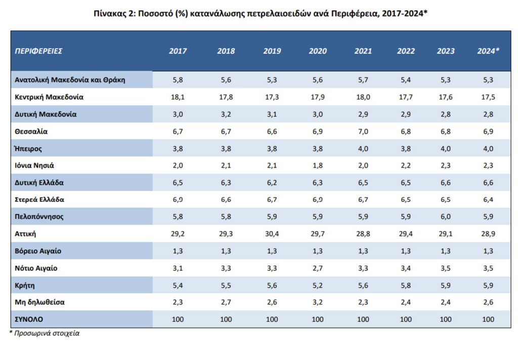 Οι χαμηλότερες καταναλώσεις παρατηρούνται στις περιφέρειες των Ιονίων Νήσων και του Βορείου Αιγαίου.