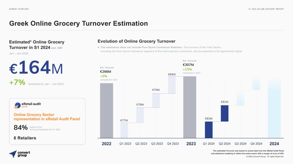 Για το πρώτο μισό του 2024, η αύξηση του τζίρου των Online Super Market ήταν 7% και άγγιξε τα €164εκ σε τιμές λιανικής συμπεριλαμβανομένου του ΦΠΑ, χωρίς όμως να περιλαμβάνονται Q-Commerce παίκτες με δικές τους αποθήκες όπως eFood Market & Wolt Market που κερδίζουν συνεχώς μερίδιο στην ελληνική αγορά.