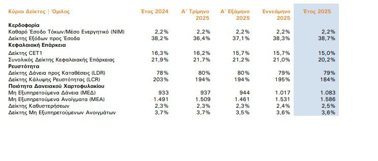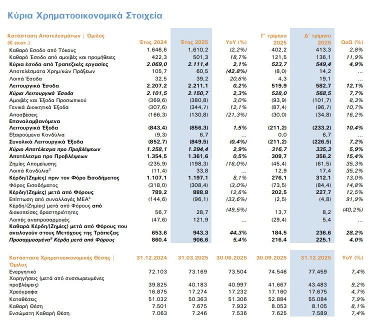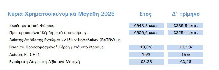 Το δ’ τρίμηνο του 2025, η τράπεζα κατέγραψε καθαρά κέρδη €236,6 εκατ. (προσαρμοσμένα €225,1 εκατ.), με τον δείκτη απόδοσης ενσώματων ιδίων κεφαλαίων (RoTBV) να διαμορφώνεται στο 13,1% για το τρίμηνο και στο 13,8% για το έτος. Τα κέρδη ανά μετοχή ανήλθαν σε €0,36, ενώ η ενσώματη λογιστική αξία ανά μετοχή διαμορφώθηκε σε €3,28.