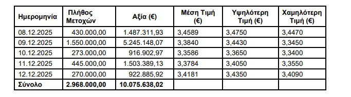 10.12.2025: 273.000 μετοχές, 916.902,97 € και μέση τιμή 3,3586 € (υψηλ. 3,3650 € / χαμηλ. 3,3400 €)