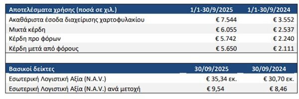 Το χαρτοφυλάκιο της εταιρείας σημείωσε απόδοση 18,54% με την εσωτερική αξία του χαρτοφυλακίου να ανέρχεται σε 35,34 εκατ. ευρώ ή 9,54 ευρώ ανά μετοχή στις 30/09/2025