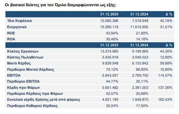 Τα κέρδη προ χρηματοοικονομικών, φόρων και αποσβέσεων για τη χρήση 2025 ανήλθαν σε € 5,94 εκ. έναντι € 2,77 εκ. της προηγούμενης χρήσης, σημειώνοντας αύξηση κατά 114,57 %.