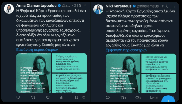 Στον λογαριασμό της Αννας Διαμαντοπούλου δημοσιεύτηκε αυτούσια ανάρτηση που προηγουμένως είχε δημοσιευθεί στον λογαριασμό της υπουργού Εργασίας Νίκης Κεραμέως