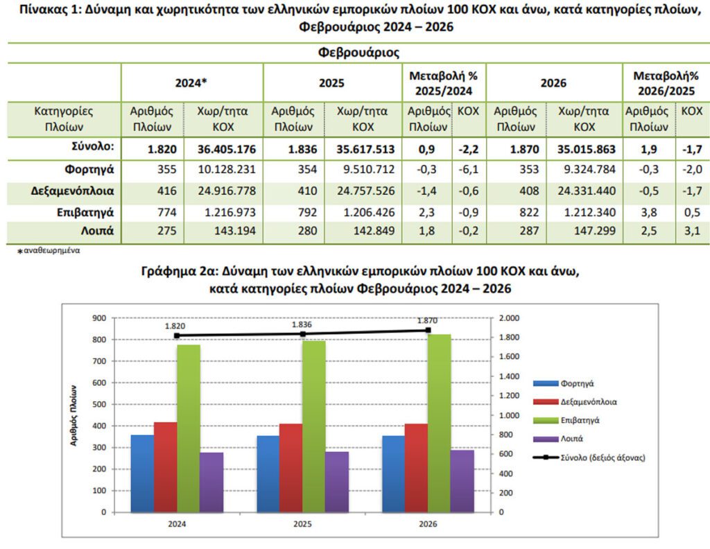 • Η Ολική Χωρητικότητα του Ελληνικού Εμπορικού Στόλου, από πλοία 100 ΚΟΧ και άνω, παρουσίασε μείωση κατά 1,7% τον μήνα Φεβρουάριο 2026 σε σύγκριση με την αντίστοιχη χωρητικότητα του Φεβρουαρίου 2025. Μείωση 2,2% είχε σημειωθεί και κατά την αντίστοιχη σύγκριση του Φεβρουαρίου έτους 2025 προς τον Φεβρουάριο 2024.