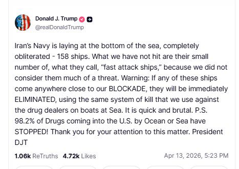 Ο Ντόναλντ Τραμπ προχώρησε σε νέα απειλητική ανάρτηση για το Ιράν, αμέσως μετά την έναρξη της αμερικανικής επιχείρησης αποκλεισμού της θαλάσσιας πρόσβασης προς και από ιρανικά λιμάνια. Στην ανάρτησή του υποστήριξε ότι το ιρανικό ναυτικό έχει «καταστραφεί ολοκληρωτικά», κάνοντας λόγο για 158 πλοία που βρίσκονται «στον βυθό της θάλασσας», ενώ προειδοποίησε ότι όσα «γρήγορα επιθετικά σκάφη» του Ιράν πλησιάσουν τον αμερικανικό αποκλεισμό θα «εξουδετερωθούν άμεσα», όπως εξουδετερώσαμε τα πλοία των εμπόρων ναρκωτικών.