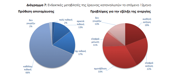 Ο δείκτης της πρόθεσης για αποταμίευση τους προσεχείς 12 μήνες υποχώρησε στις –66,6 μονάδες από -62,9 τον Σεπτέμβριο. Το 83% (από 81%) των νοικοκυριών δεν θεωρεί πιθανή την αποταμίευση στο επόμενο 12μηνο ενώ το 15% τη θεωρεί πιθανή ή πολύ πιθανή. Οι σχετικοί δείκτες διαμορφώθηκαν στις +8,5 μονάδες στην ΕΕ και +8,0 μονάδες στην Ευρωζώνη.