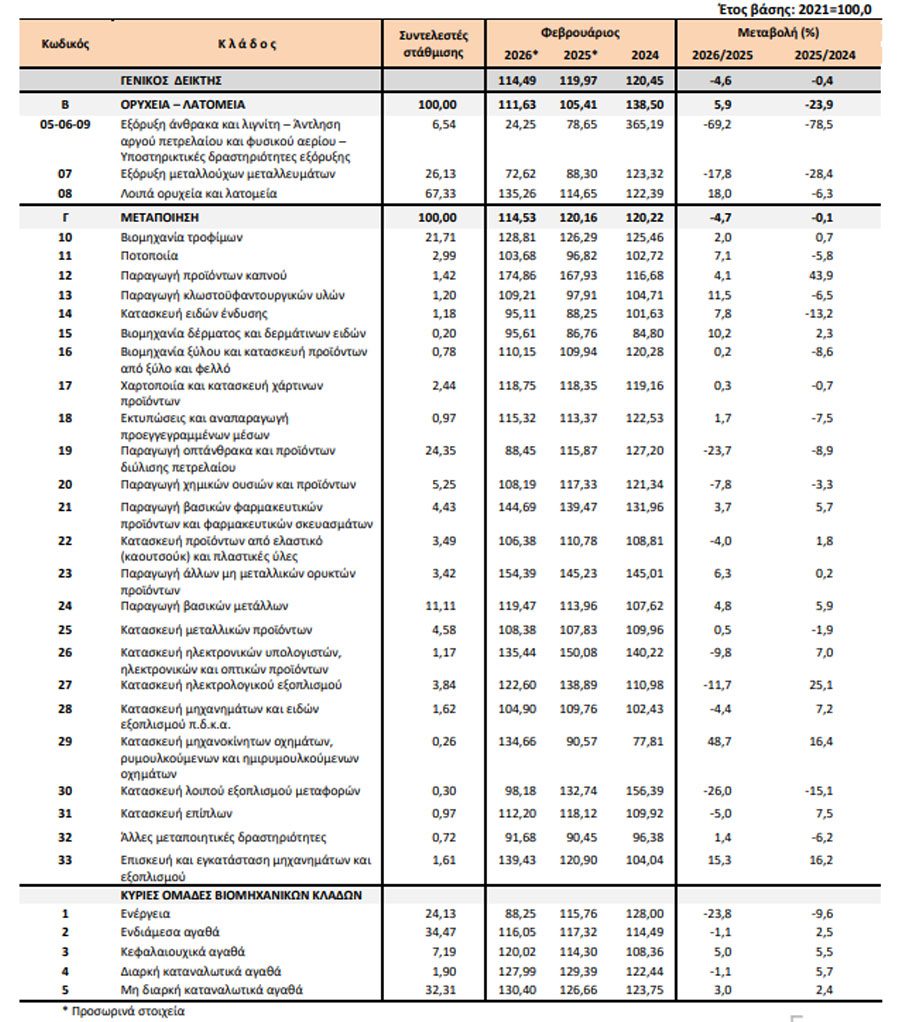 Η εικόνα αυτή δεν αναιρείται από τη μηνιαία αύξηση 3,5% που καταγράφηκε τον Φεβρουάριο σε σχέση με τον Ιανουάριο. Η άνοδος σε μηνιαία βάση δείχνει μια πρόσκαιρη βελτίωση του ρυθμού, ωστόσο σε ετήσιο ορίζοντα η τάση παραμένει καθοδική. Ακόμη πιο ενδεικτικό είναι ότι στο δωδεκάμηνο Μαρτίου 2025 – Φεβρουαρίου 2026 ο μέσος δείκτης εμφάνισε μείωση 0,8%, όταν στο αμέσως προηγούμενο δωδεκάμηνο είχε σημειωθεί αύξηση 1,6%. Με άλλα λόγια, η συνολική δυναμική της βιομηχανίας αποδυναμώνεται.