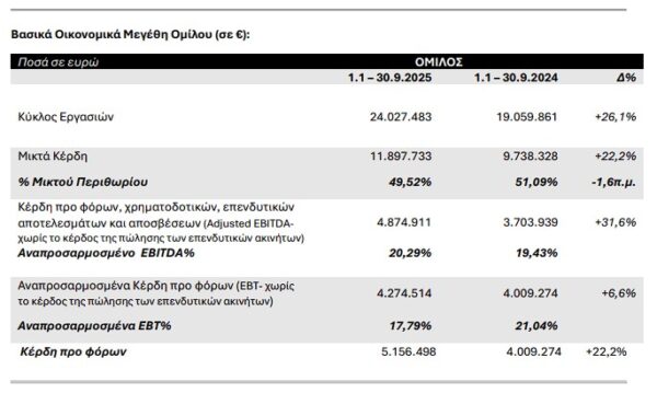 Τα αποτελέσματα του εννεάμηνου επιβεβαιώνουν τις προβλέψεις της Διοίκησης για βελτιωμένα αποτελέσματα το 2025 έναντι της χρήσης 2024.