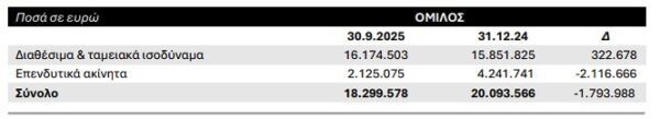 Στις 30 Σεπτεμβρίου 2025, ο Όμιλος διατηρούσε μηδενικό δανεισμό, ενώ τα ταμειακά διαθέσιμα και ισοδύναμα παρέμειναν σε υψηλά επίπεδα, πιστοποιώντας την διατήρηση της ισχυρής ρευστότητας.