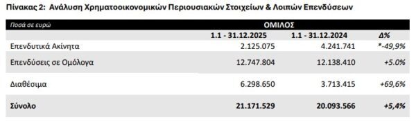 Στο πλαίσιο της διαχείρισης του χαρτοφυλακίου ακινήτων που διαθέτει η Εταιρία, κατά τη διάρκεια της χρήσης 2025 ολοκληρώθηκαν κινήσεις αξιοποίησης επενδυτικών ακινήτων, οι οποίες είχαν θετική επίδραση στα αποτελέσματα της περιόδου, χωρίς να μεταβάλουν τον συνολικό στρατηγικό προσανατολισμό του Ομίλου.