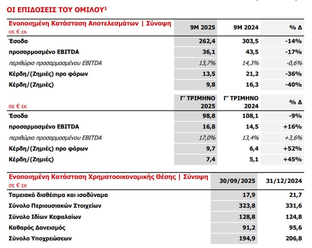 ▪ Προσαρμοσμένο EBITDA στα €36,1εκ (περιθώριο 13,7%), αποτυπώνει την επίπτωση της μείωσης των εσόδων, παρά τις προσπάθειες εξορθολογισμού του κόστους και την ευνοϊκότερη διάρθρωση των εσόδων προς υπηρεσίες και λύσεις με υψηλότερα περιθώρια κέρδους. Το προσαρμοσμένο EBITDA Γ’ Τριμήνου 2025 στα €16,8εκ (περιθώριο 17,0%), αυξημένο 16% έναντι του Γ’ Τριμήνου 2024 και πάνω από 100% έναντι του Β΄Τριμήνου 2025, λόγω του ισχυρού χαρτοφυλακίου συμβασιοποιημένων έργων και της μεγαλύτερης συνεισφοράς υπηρεσιών και λύσεων με υψηλότερα περιθώρια κέρδους.