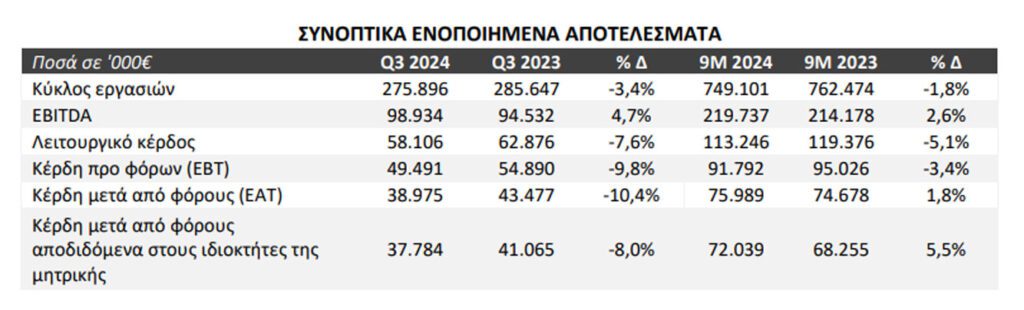 Σε επίπεδο εννεάμηνου, ο ενοποιημένος Κύκλος Εργασιών ανήλθε σε €749,1 εκατ. έναντι €762,5 εκατ. την αντίστοιχη περσινή περίοδο. Αντίστοιχα, το ΕΒΙTDA ανήλθε στα €219,7 εκατ., αυξημένο κατά 2,6%, ενώ τα ενοποιημένα Κέρδη μετά από Φόρους διαμορφώθηκαν σε €76 εκατ., οριακά αυξημένα κατά 1,8%. Ο Κύκλος Εργασιών αλλά και η λειτουργική κερδοφορία στηρίχθηκαν από την για άλλη μια χρονιά ιδιαίτερα θετική διαχείριση της ζήτησης για βραχυχρόνιες, κυρίως τουριστικές, μισθώσεις αλλά και από τη σημαντική αύξηση του στόλου των μακροχρόνιων ενοικιάσεων κατά τους τελευταίους 12 μήνες. Αντίθετα η δραστηριότητα τηςεμπορίας αυτοκίνητων είχε μικρή υποχώρηση σε σχέση με το 2023 διατηρώντας όμως σημαντική κερδοφορία.