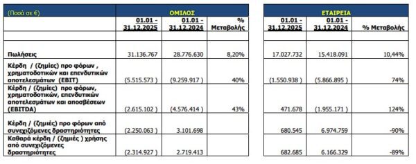 Τα αποτελέσματα προ φόρων, χρηματοδοτικών, επενδυτικών αποτελεσμάτων και αποσβέσεων (EBITDA) του Ομίλου από συνεχιζόμενες δραστηριότητες για τη χρήση 2025 διαμορφώθηκαν σε ζημιές € 2,62 εκ. έναντι ζημιών € 4,58 εκ. το 2024. Τα σχετικά μεγέθη για την Εταιρεία διαμορφώθηκαν σε κέρδη € 472 χιλ. έναντι ζημιών € 1,96 εκ. για τη χρήση του 2024.