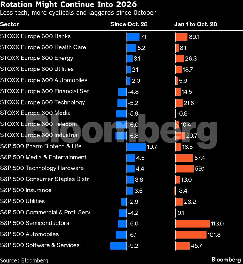 Οι επενδυτές εναλλάσσουν τις τοποθετήσεις τους τους τελευταίους δύο μήνες, καθώς ο τομέας της τεχνητής νοημοσύνης και των ημιαγωγών βρίσκεται σε στασιμότητα και εμφανίζονται πιο ελκυστικές επιλογές αλλού. Πρόκειται για ένα μοτίβο που παρατηρείται τόσο στις ΗΠΑ όσο και στην Ευρώπη, αν και οι λεπτομέρειες διαφέρουν μεταξύ των περιοχών. Η εναλλαγή συμβάλλει στη διεύρυνση της δυναμικής της αγοράς, καθώς οι επενδυτές επιδιώκουν ένα μείγμα μετοχών που εκτίθενται στην οικονομία, αμυντικές τοποθετήσεις και στοιχήματα σε τομείς που υστερούν.