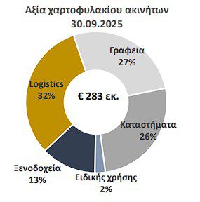 Οι ανωτέρω πωλήσεις απέφεραν συνολικά κέρδη υπεραξίας € 4,0 εκ. σε σχέση με την αξία κτήσης των εν λόγω ακινήτων, εκ των οποίων € 1,3 εκ. καταγράφονται στη χρήση 2025. Aξία χαρτοφυλακίου ακινήτων 30.09.2025 Logistics 32% Γραφεια 27% € 283 εκ. Ξενοδοχεία 13% Καταστήματα 26% Ειδικής χρήσης 2%