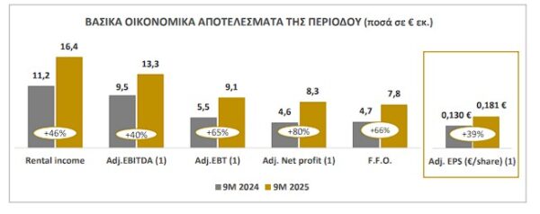 Την 30η Σεπτεμβρίου 2025, το χαρτοφυλάκιο ακινήτων της Εταιρείας περιλάμβανε 54 ακίνητα εύλογης αξίας € 283 εκ., έναντι 57 ακινήτων εύλογης αξίας € 285 εκ. την 31.12.2024. Κατά τους πρώτους εννέα μήνες του 2025, η Εταιρεία πούλησε τρία (3) ακίνητα και συγκεκριμένα δύο ορόφους γραφείων στον Πύργο Αθηνών και ένα κτίριο γραφείων στην Χάρητος 3 στο Κολωνάκι.