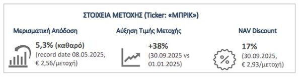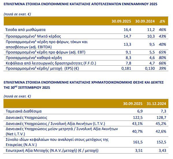 • Το σύνολο των ιδίων κεφαλαίων (NAV) που αντιστοιχούν σε μετόχους της Εταιρείας την 30η Σεπτεμβρίου 2025 αυξήθηκε κατά 5,9% και ανήλθε σε € 161,5 εκ. (31.12.2024: € 152,5 εκ.) μετά και τη διανομή μερίσματος ύψους € 6,0 εκ. που καταβλήθηκε στις 29.05.2025.