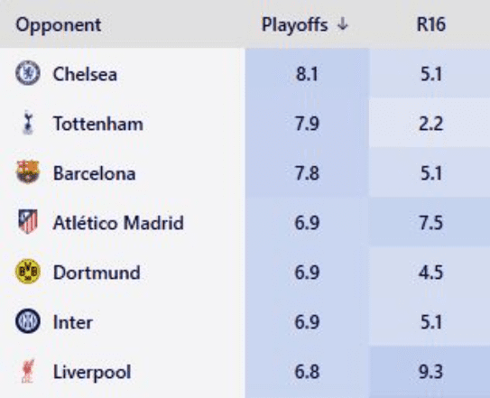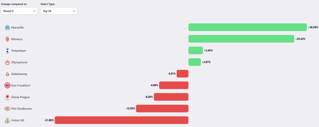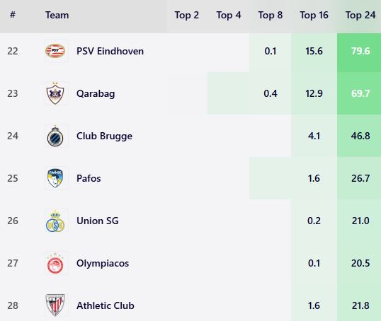 Οι πιθανότητες του DataMB «λένε» Τσέλσι (8,1%) και πιο κάτω Τότεναμ (7,9%) και Μπαρτσελόνα (7,8%), ωστόσο ακόμη και ένα γκολ μπορεί να αλλάξει την τελική βαθμολογία της League Phase, μιας και η διαφορά τερμάτων είναι το πρώτο κριτήριο ισοβαθμίας.