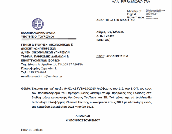 Παρότι στην Ελλάδα έχουμε τα τελευταία χρόνια πολλές εταιρείες digital marketing, οι οποίες ασχολούνται με την προβολή επιχειρήσεων και φορέων στα social media, φαίνεται πως για την ελληνική πολιτεία δεν είναι αρκετές και προτιμούν υπηρεσίες από το εξωτερικό, που πιθανότατα μπορεί να είναι πιο εξειδικευμένες και να επιτυγχάνουν καλύτερα αποτελέσματα μέσα σε λιγότερο χρόνο. Δεν εξηγείται διαφορετικά το γεγονός πως πριν από μερικές ώρες εγκρίθηκε από το Υπουργείο Τουρισμού κονδύλι 475.000 ευρώ (589.000 με το ΦΠΑ) από τον Δεκέμβριο του 2025 μέχρι τον Ιούνιο του 2026 για τη διαφήμιση της χώρας μας στα social media από αμερικανική εταιρεία, την Channel Factory. Η απόφαση μάλιστα έχει και την ένδειξη ”Επείγον”.