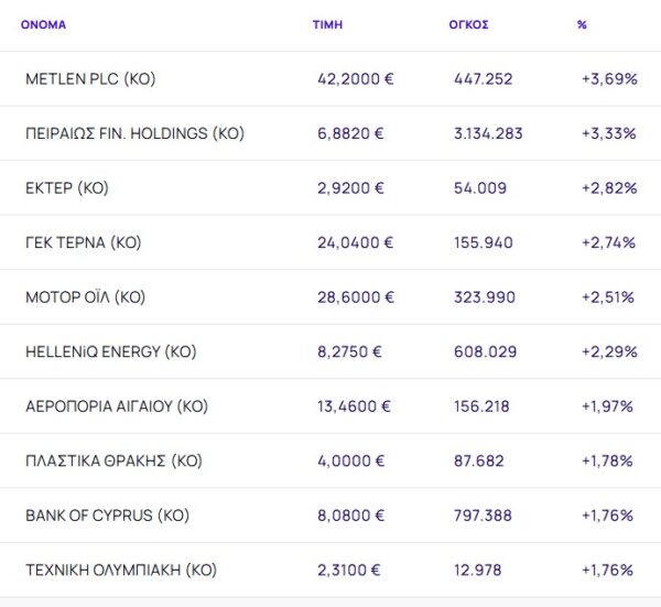 Οι μετοχές με τη μεγαλύτερη άνοδο ήταν: