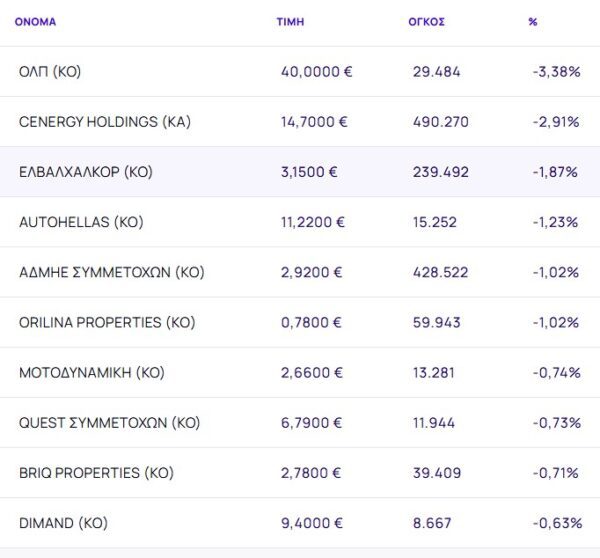 Οι μετοχές με τη μεγαλύτερη πτώση ήταν:
