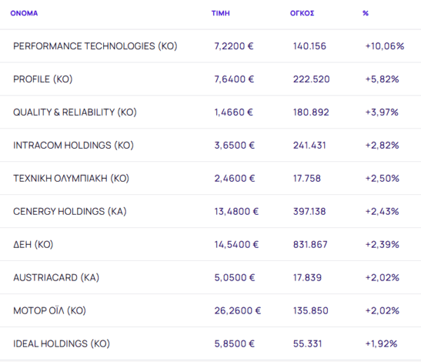 Οι μετοχές με τη μεγαλύτερη άνοδο ήταν: