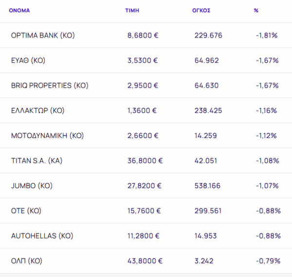 Οι μετοχές με τη μεγαλύτερη πτώση ήταν: