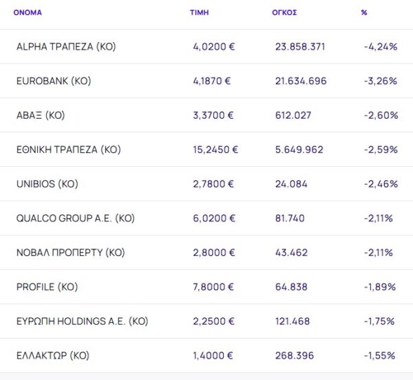 Οι μετοχές με τη μεγαλύτερη πτώση ήταν: