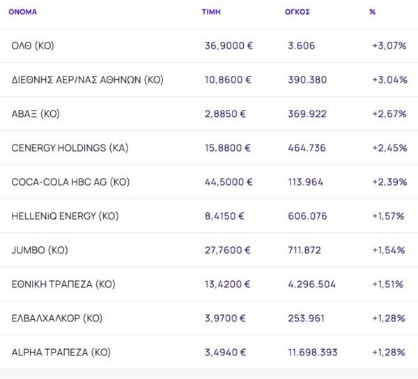 Οι μετοχές με τη μεγαλύτερη άνοδο ήταν: