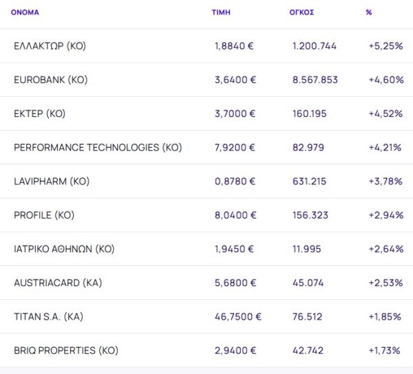 Οι μετοχές με τη μεγαλύτερη άνοδο ήταν: