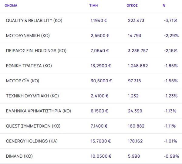 Οι μετοχές με τη μεγαλύτερη πτώση ήταν: