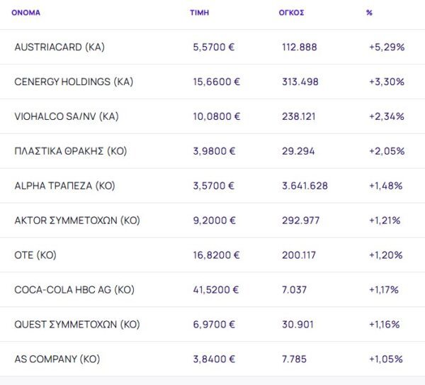 Οι μετοχές με τη μεγαλύτερη άνοδο ήταν: