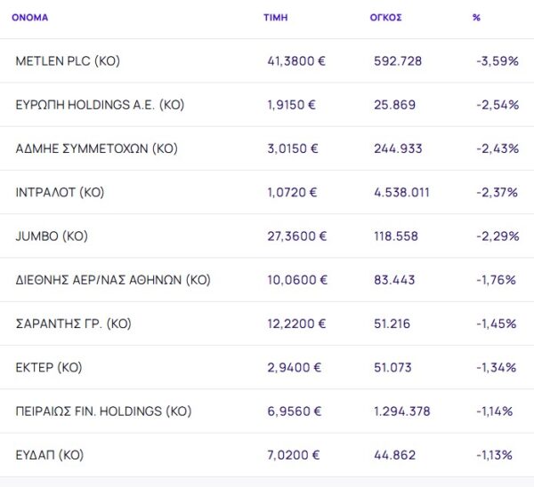 Οι μετοχές με τη μεγαλύτερη πτώση ήταν: