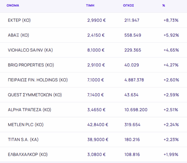 Τέλος, η ΕΚΤΕΡ εκτινάχθηκε με +8,73% και έκλεισε στα 2,99 ευρώ.