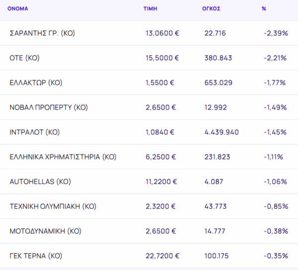 Οι μετοχές με τη μεγαλύτερη πτώση ήταν: