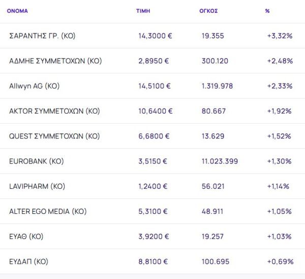 Οι μετοχές με τη μεγαλύτερη άνοδο ήταν: