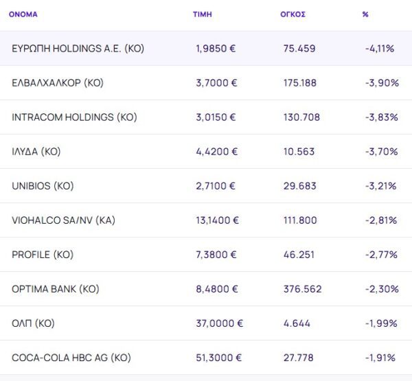 Οι μετοχές με τη μεγαλύτερη πτώση ήταν: