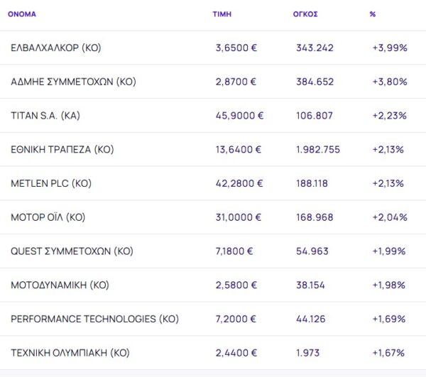 Οι μετοχές με τη μεγαλύτερη άνοδο ήταν: