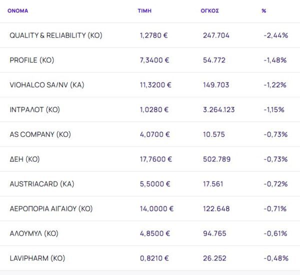 Οι μετοχές με τη μεγαλύτερη πτώση ήταν: